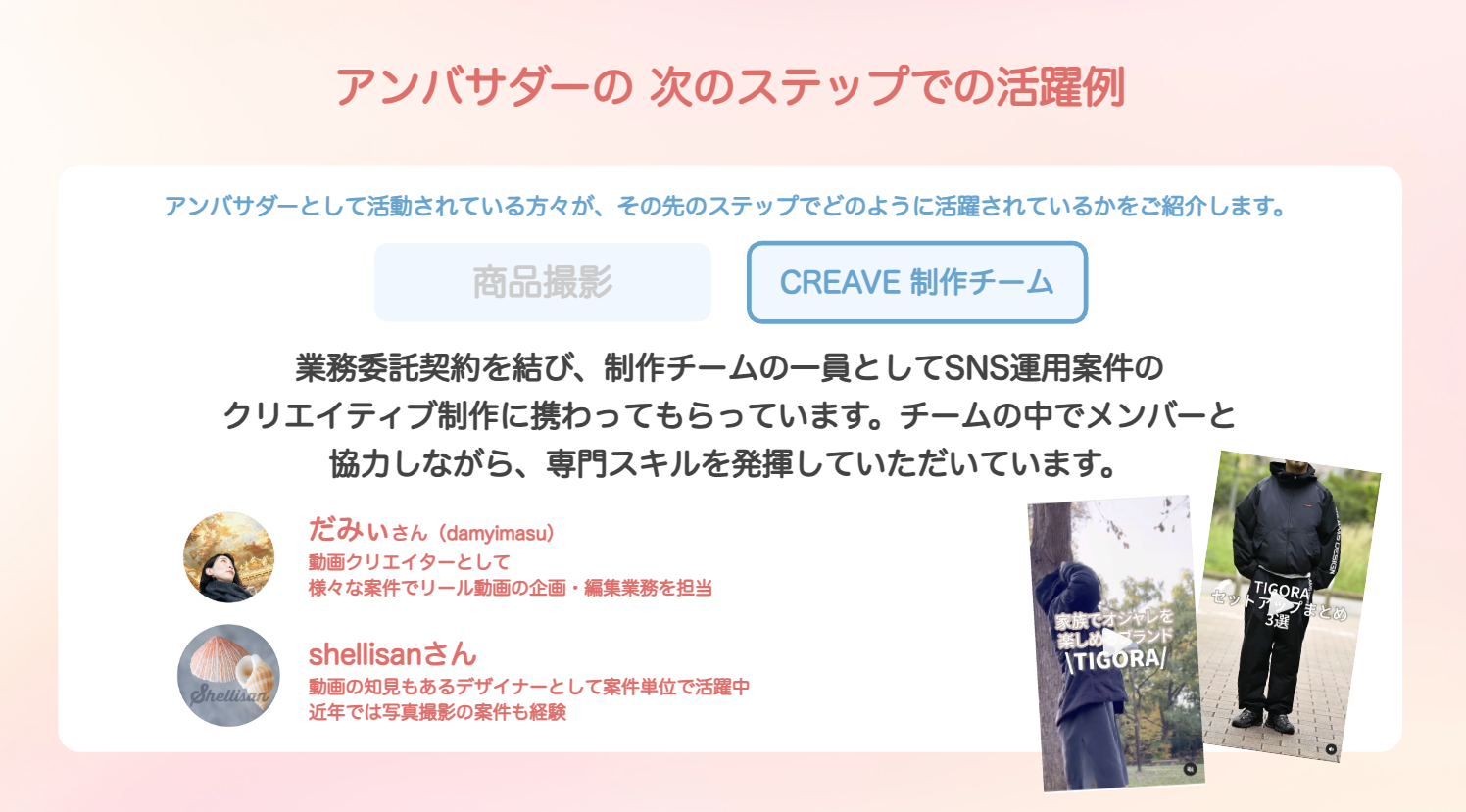 もちろん「アンバサダーのクリエイティブが良かったから」という理由でその商品のお仕事をご依頼することも多々ありますので、アンバサダーを頑張ること自体も、お仕事依頼に直接つながっています。