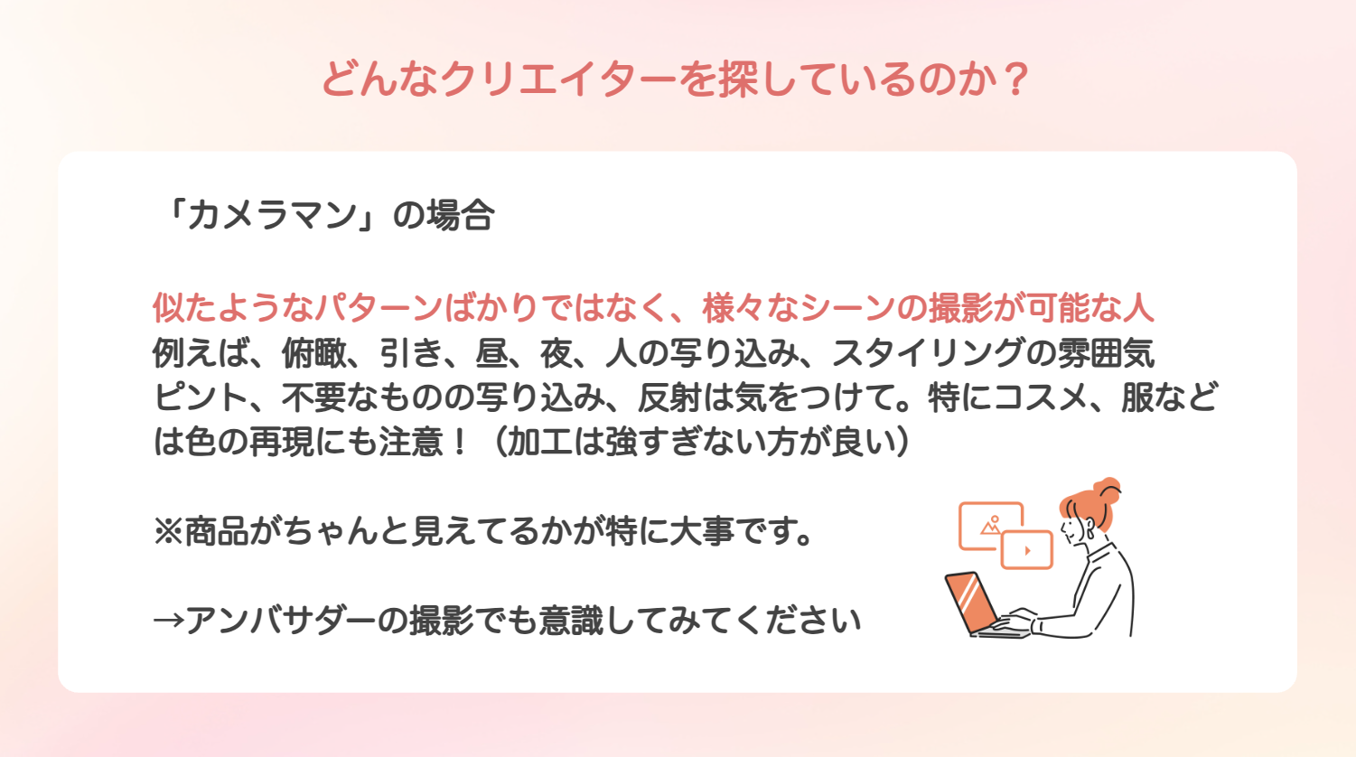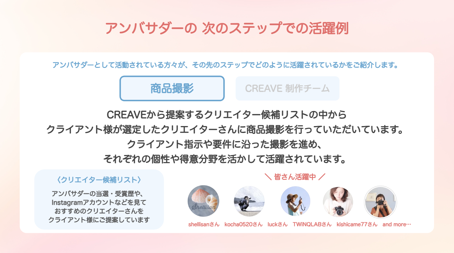 もちろん「アンバサダーのクリエイティブが良かったから」という理由でその商品のお仕事をご依頼することも多々ありますので、アンバサダーを頑張ること自体も、お仕事依頼に直接つながっています。