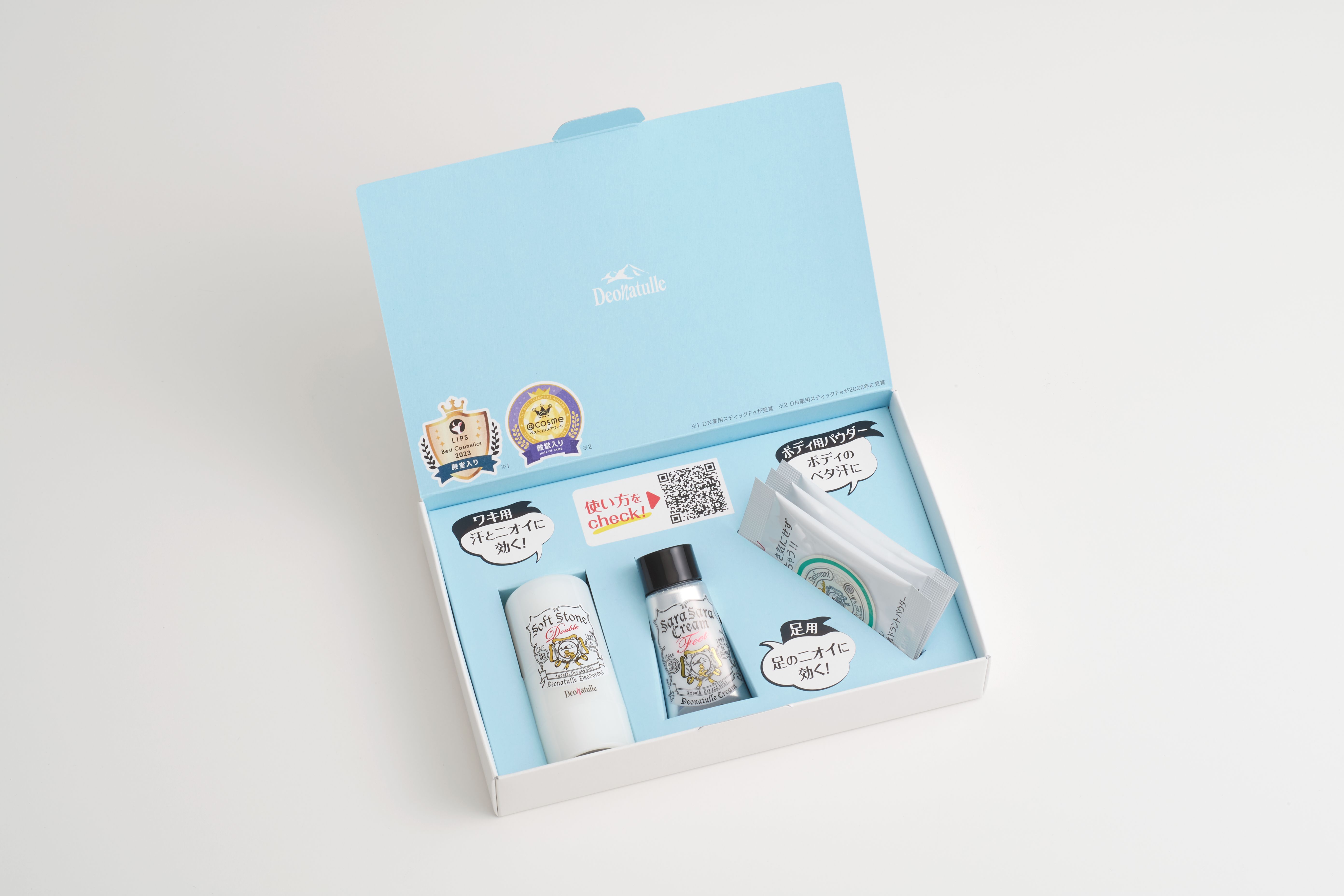 「薬用デオナチュレ ソフトストーンW ミニサイズ」「薬用デオナチュレ足指さらさらクリーム ミニサイズ」「薬用デオナチュレさらさらデオドラントパウダーサシェ(1g)/3包」のお試しセットをお送りいたします。