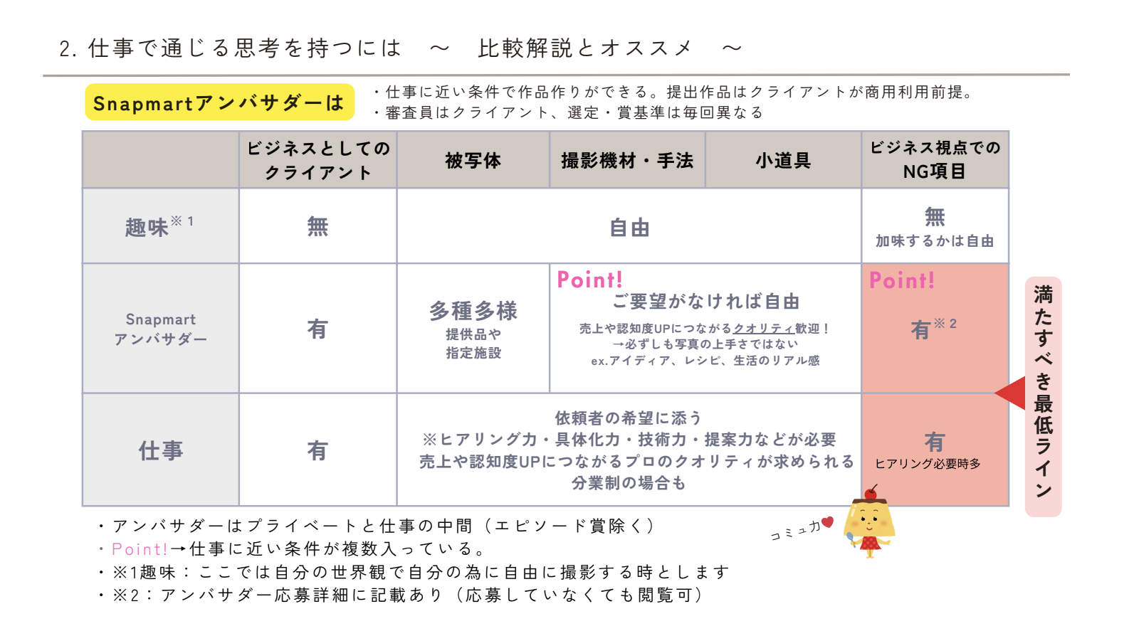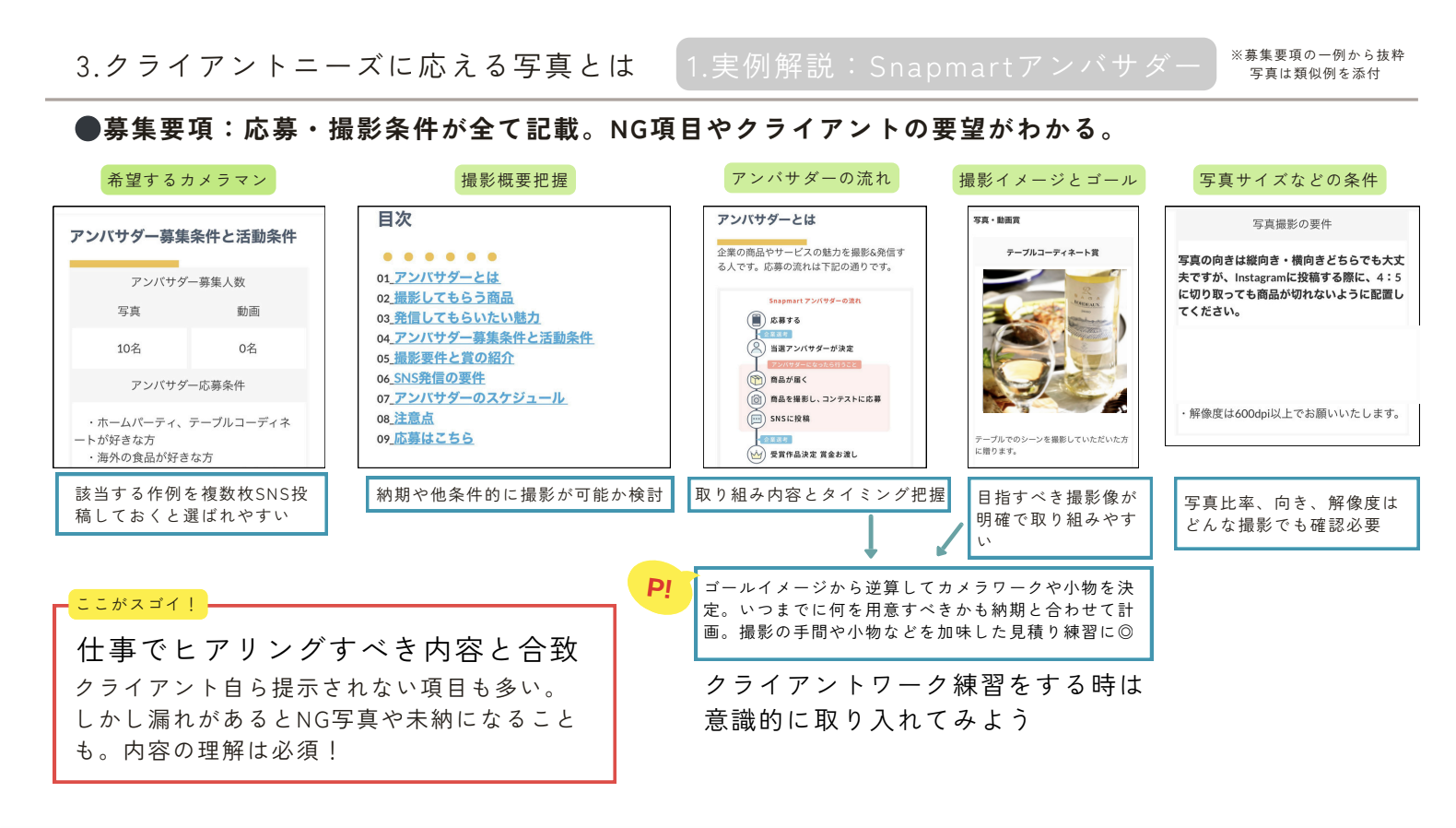 アンバサダーの募集要項には、仕事でヒアリングすべき内容や、商用利用を目的に記載されたポイントが多く含まれています。