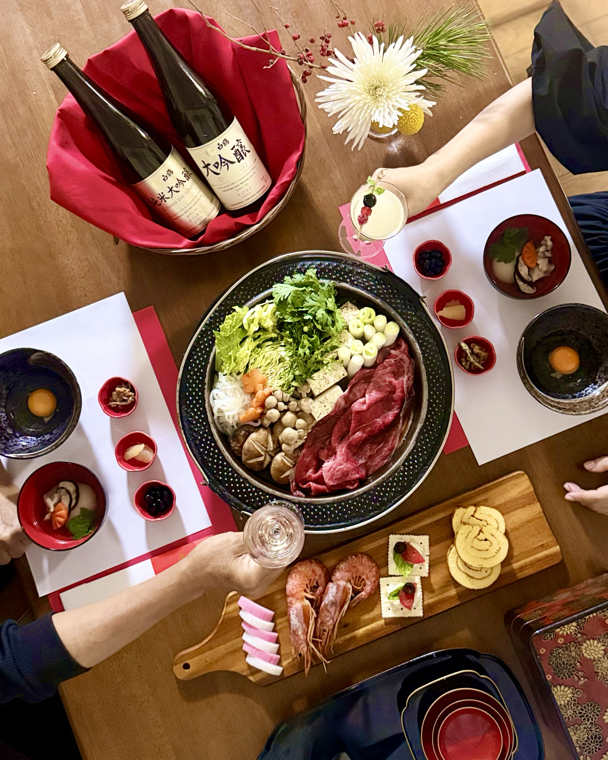 すき焼きとのペアリングを楽しんでいる様子、年末年始にみんなですき焼きを囲んで「大吟醸」や「純米大吟醸」を楽しんでいる様子を撮影してくださった方へ贈呈します。