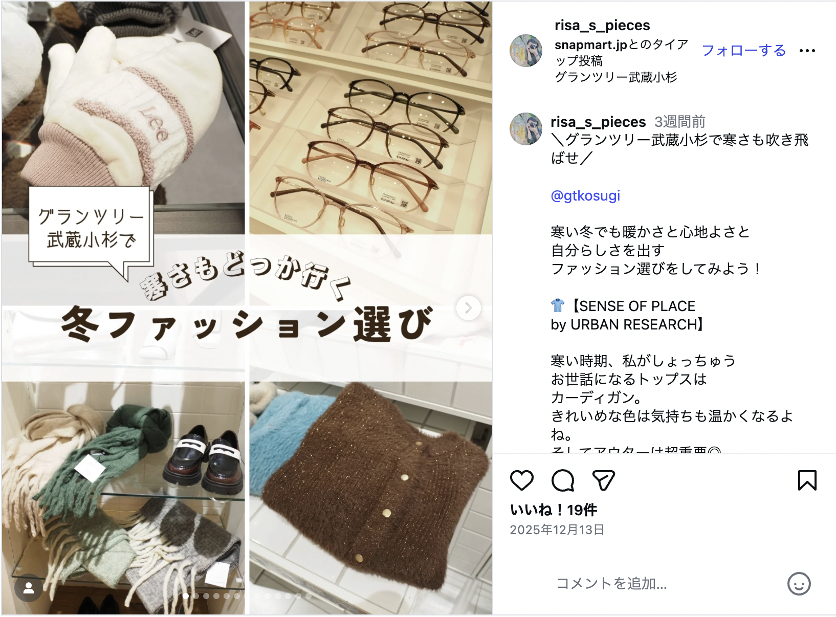 施設の魅力やおすすめの過ごし方などを発信いただいたことで、「グランツリー武蔵小杉」が目指す、お客様一人ひとりに寄り添い、日常に小さな幸せや楽しさを届ける場所としての魅力をより多くのかたに伝えることができました。(募集記事)