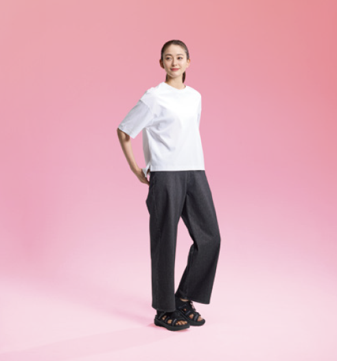 ストレッチが効いたデニム素材で、ワイドシルエットながらも動きやすく、快適な履き心地を実現。カジュアルにもきれいめにも着回し自在。嬉しいUVカット機能付き。